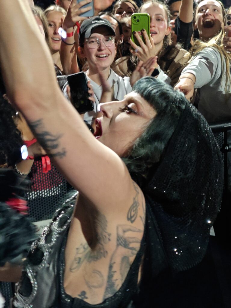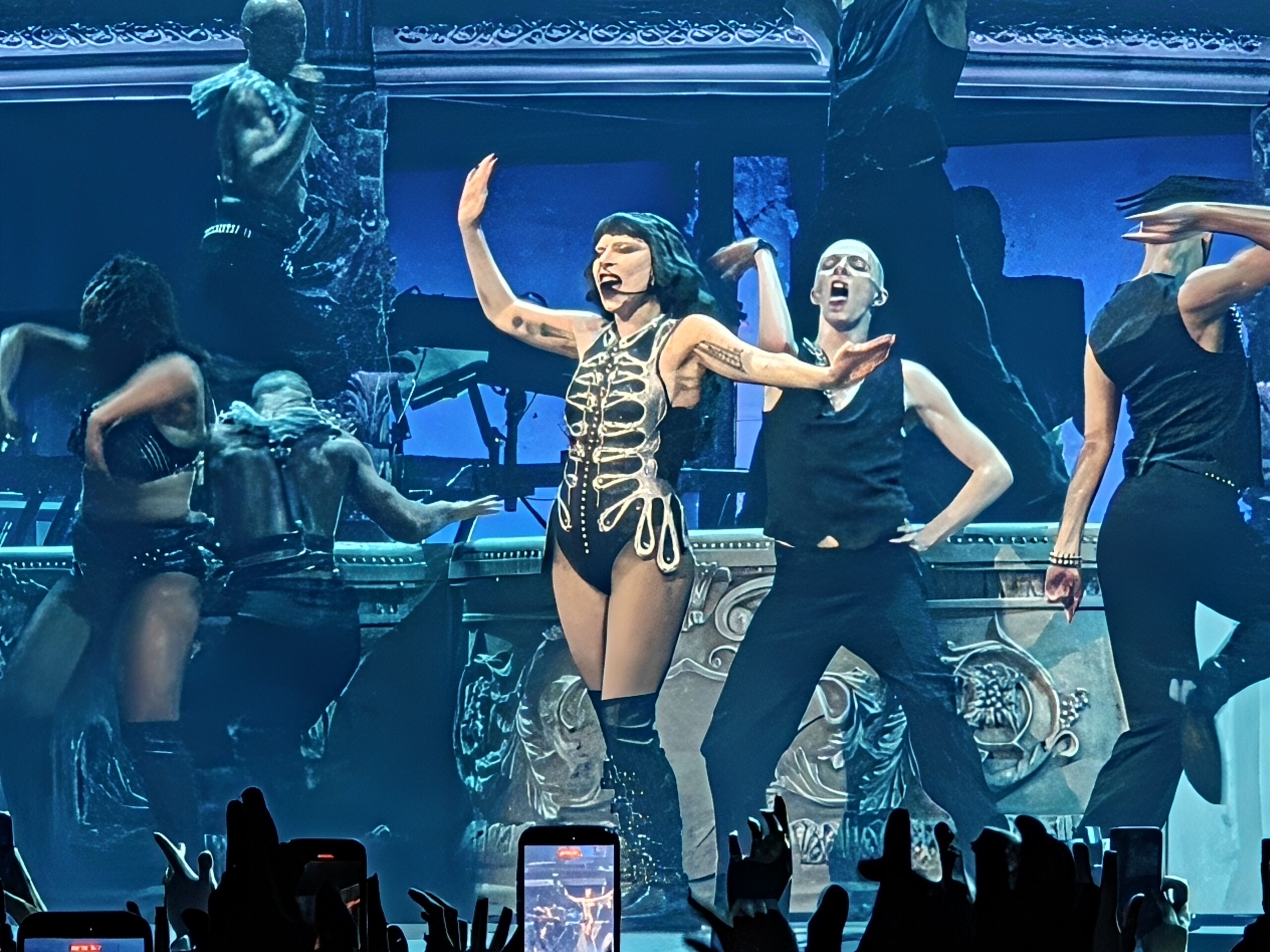 I akt två ligger hon halvt begravd i sand, omgiven av ett skelett och några zoombies, dödad av sitt alter ego – bara för att återuppstå på kryckor i en klänning med ett enormt släp som glöder i regnbågens färger, till publikens jubel. I nästa scen rullar hon ut med en gigantisk dödskalle sittandes i en ögonhåla. Sedan ”Born This Way”. Hela arenan blir en glittrande discoboll där ingen lämnas kvar. Hon tillägnar låten till queerpubliken, till deras rätt att finnas, kämpa, älska. Rösten bär, musiken pulserar, och vi bärs med.